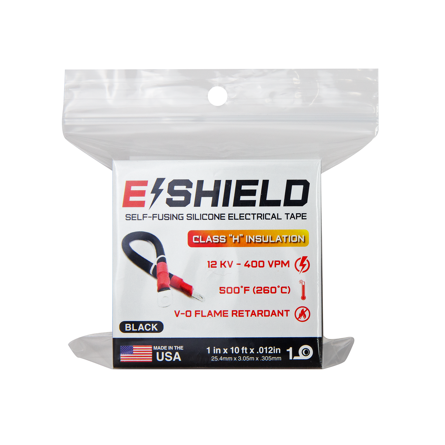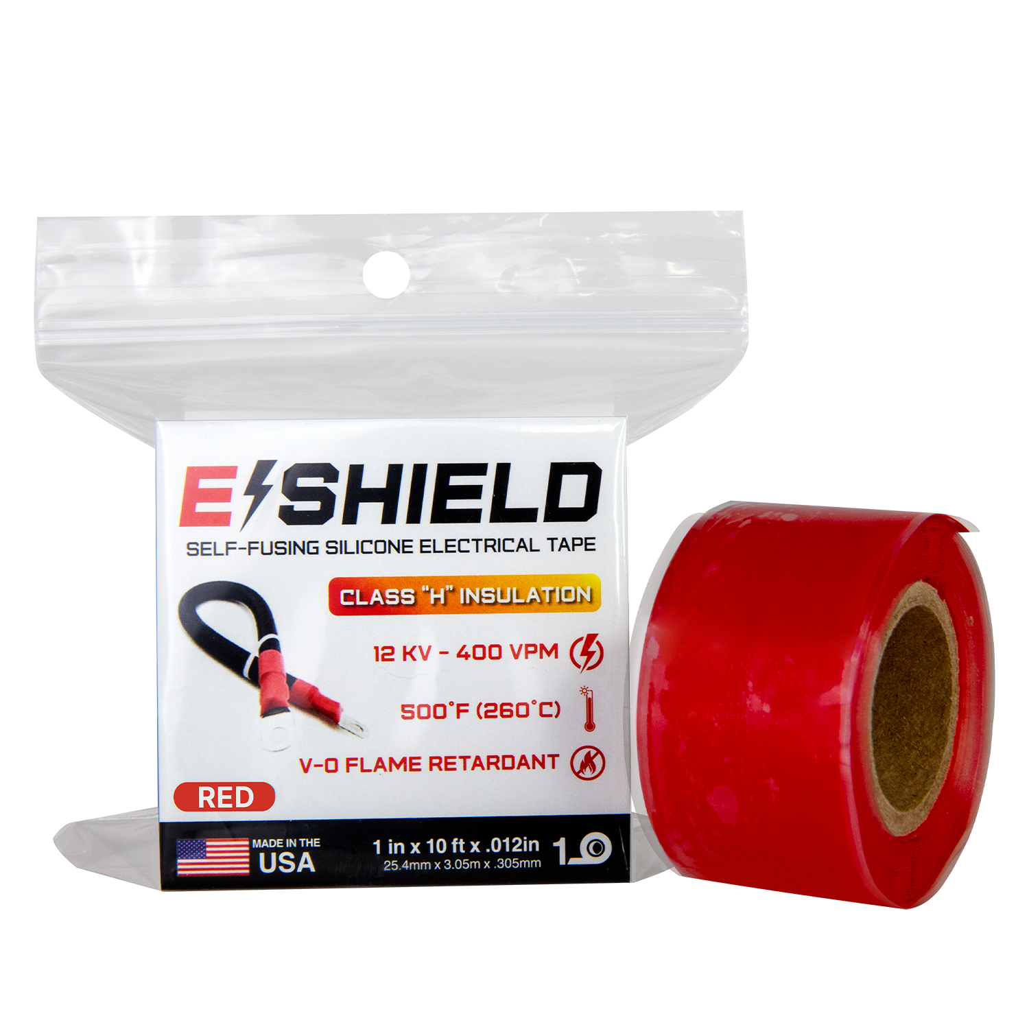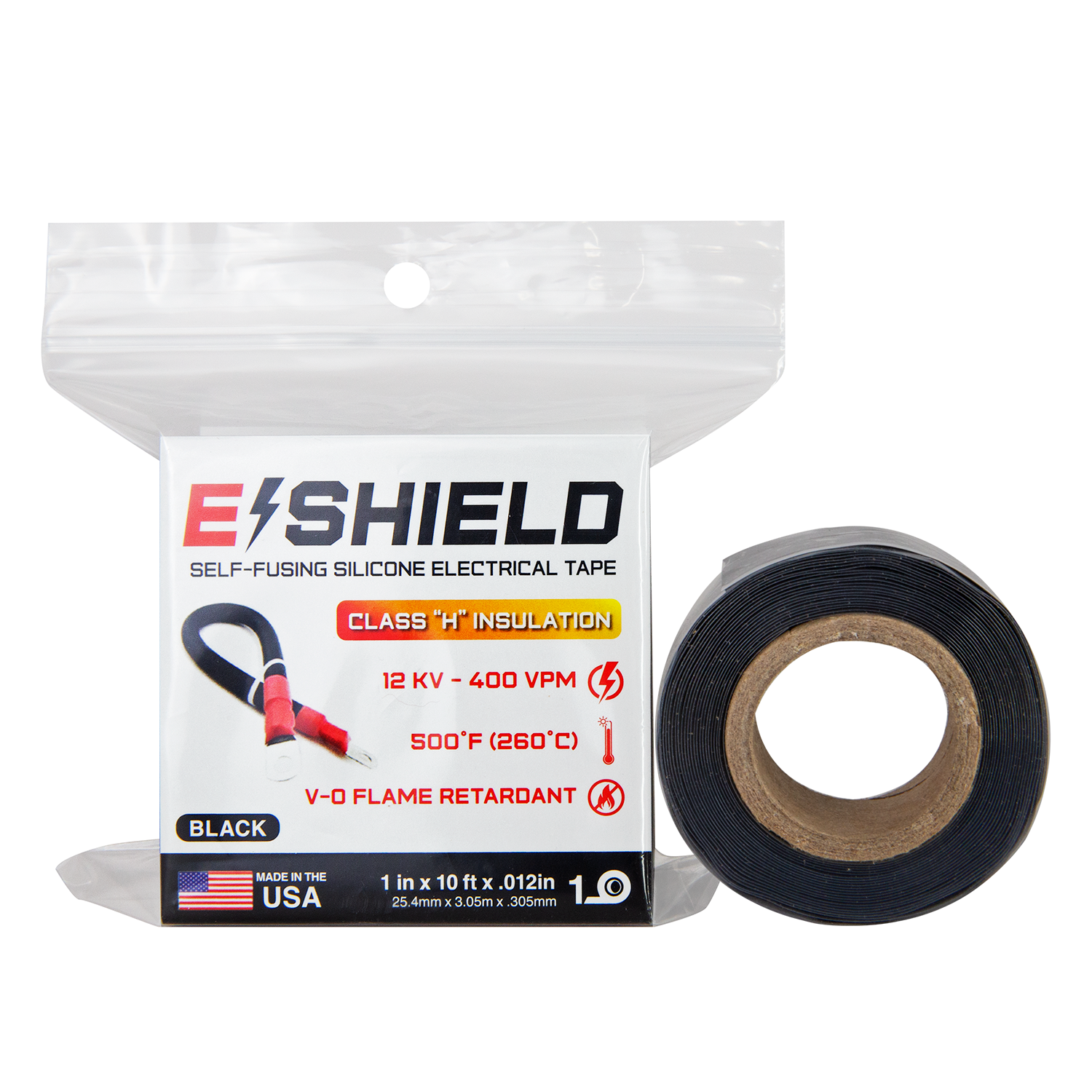 E Shield Tape is lab tested and manufactured in the USA with extruded of a high-performance silicone elastomer. Available in Black, Red, Gray, White, Blue, and Green. Each roll is 1" wide x 10' long x .012" (12mil) thick.